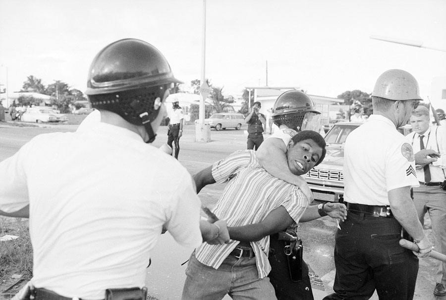 Read moreOriginal caption: Miami policemen, one holding the man's arm and the other with an arm lock on his neck, drag away a Negro youth during a clash between police and rioters in that city's predominantly Negro Liberty City district on August 8, 1968. #