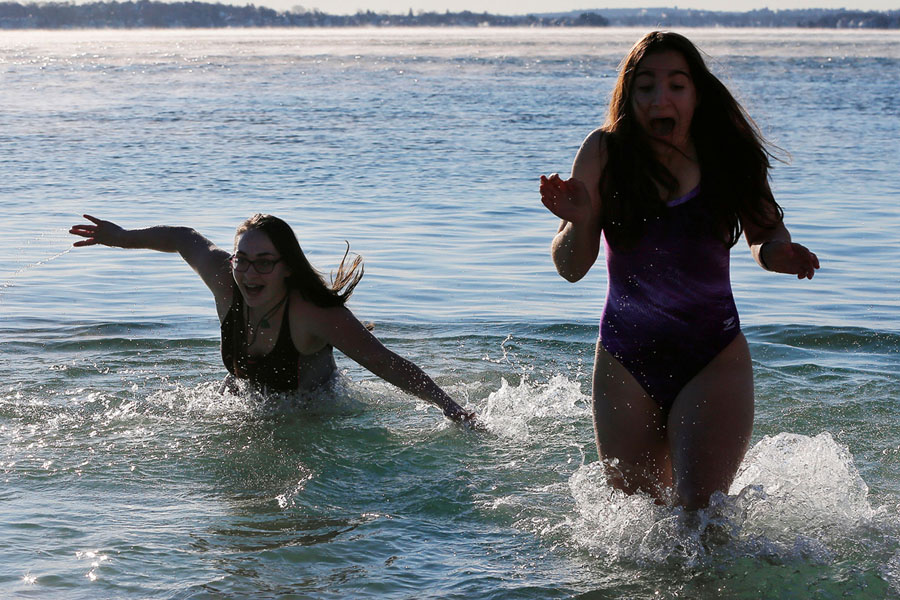 Read moreTwo women react while taking part in the annual New Year's Day L Street Brownies Polar Bear Plunge, with air temperatures at zero degrees Fahrenheit, in Boston, Massachusetts, on January 1, 2018. #