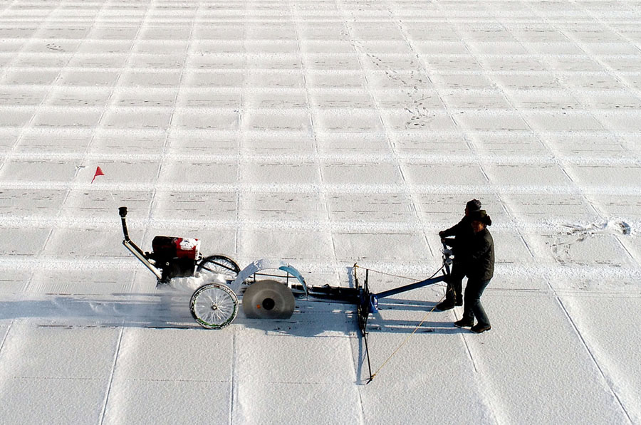 Read moreWorkers cut ice blocks from the frozen surface of Xiuhu Lake in Shenyang, northeastern China's Liaoning province, on December 20, 2017. The ice blocks are used as part of winter tourism activities in the region. #