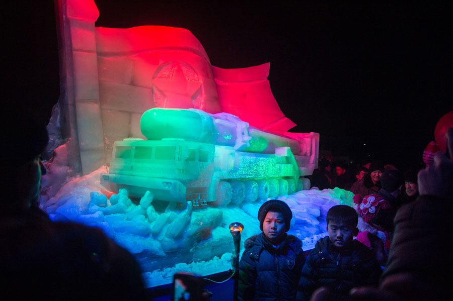 Read moreIn Pyongyang, North Korea, children pose for a photo before an ice sculpture depicting a Hwasong-15 intercontinental ballistic missile and self-propelled launcher, as people mark the new year at the Pyongyang Ice Sculpture Festival on Kim Il Sung Square on December 31, 2017. #