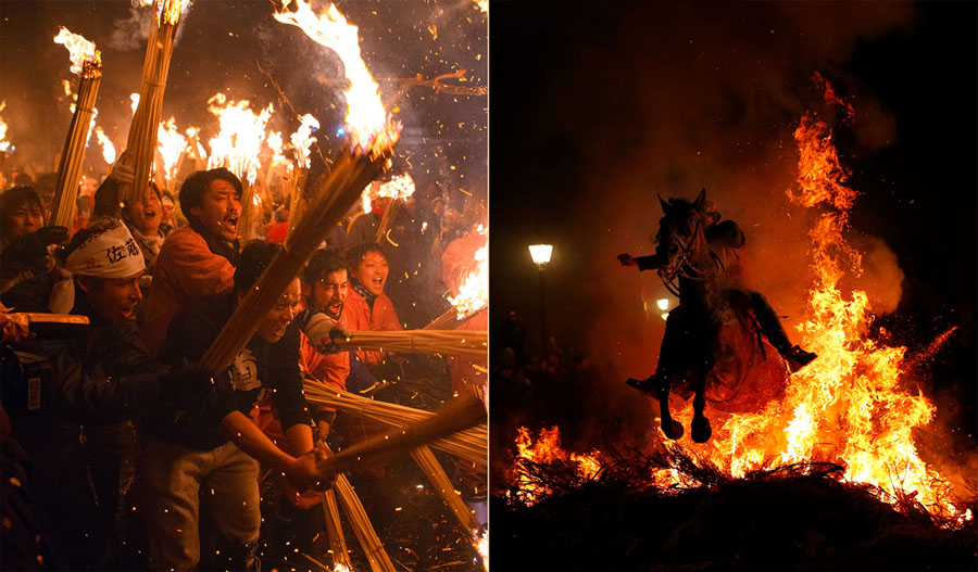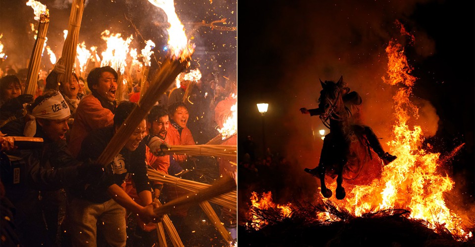 Read moreLeft: In Nozawaonsen, Japan, people rush forward with flaming sticks as they try to set fire to a wooden shrine that is protected by men from the village during the Nozawaonsen Dosojin Fire Festival on January 15, 2018. Right: In San Bartolome de Pinares, Spain, a man rides a horse through a bonfire as part of a ritual in honor of Saint Anthony the Abbot on January 16, 2018. #