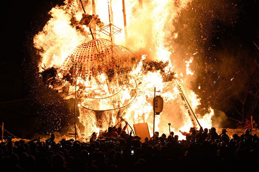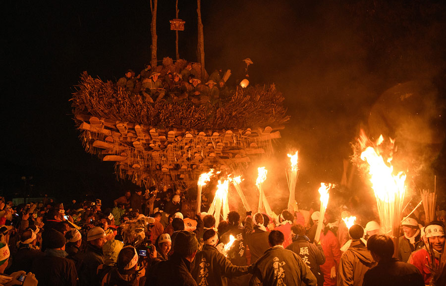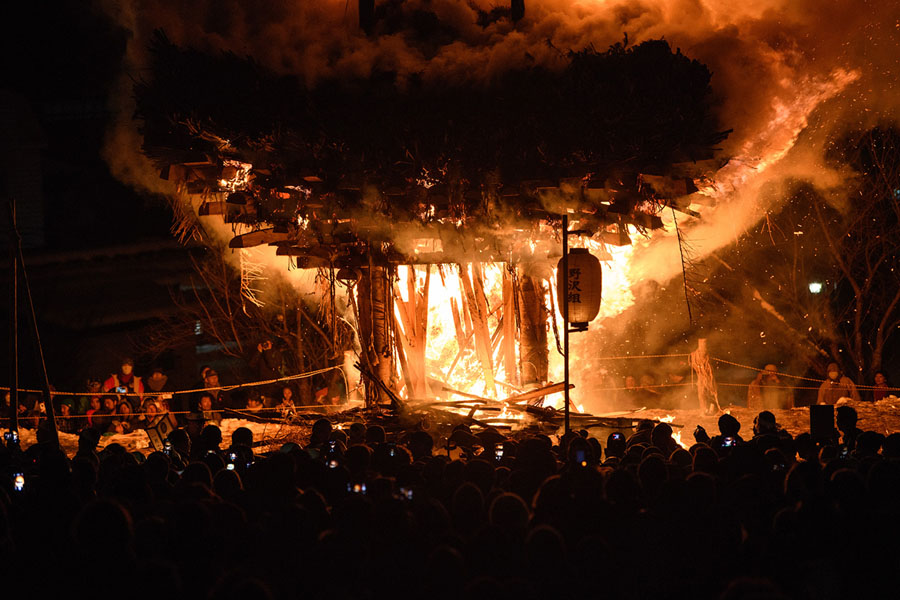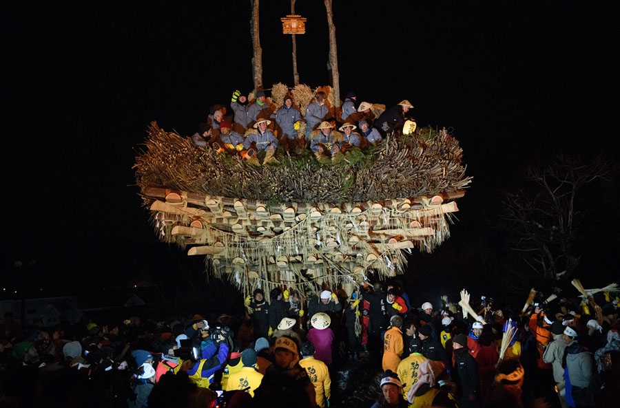 Read moreVillage men sit atop the shrine during the festival on January 15, 2018. The festival is staged by village men of 'yakudoshi' or 'unlucky' ages of 42 and 25 to celebrate the birth of a family's first child, to chase away evil spirits, and to pray for a happy marriage. The elder yakudoshi take their places atop the wooden shrine to chant and sing, while the younger yakudoshi remain below to try and defend the flammable shrine from the impending fiery attack. #