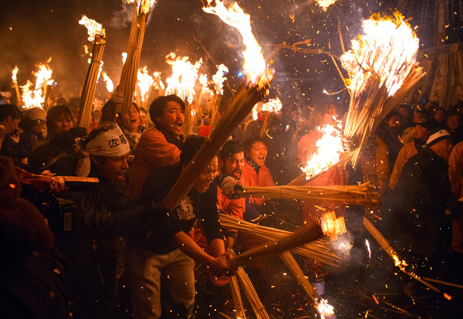 Read morePeople carry flaming sticks as they prepare to attempt to set fire to a wooden shrine that is protected by men from Nozawaonsen village during the Nozawaonsen Dosojin Fire Festival on January 15, 2018. #