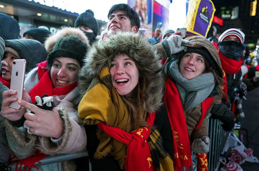 Read moreRevelers gathered in Times Square in New York watch the ceremonial ball rise to the top of a pole high above the street on December 31, 2017, in preparation for the ball drop during New Year's Eve celebrations. #