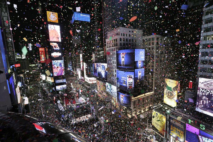 Read moreConfetti drops over the crowd as the clock strikes midnight during the New Year's celebration in Times Square as seen from the Marriott Marquis in New York, on January 1, 2018. #