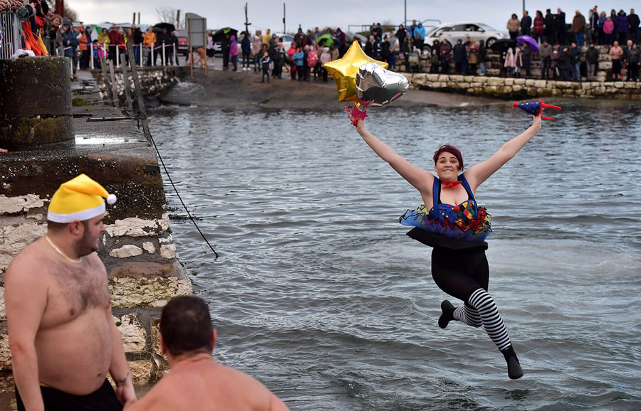 Read moreMeghan McClements braves the wintry conditions as she takes part in the annual New Year's Day swim at Carnlough harbor on January 1, 2018, in Carnlough, Northern Ireland. #