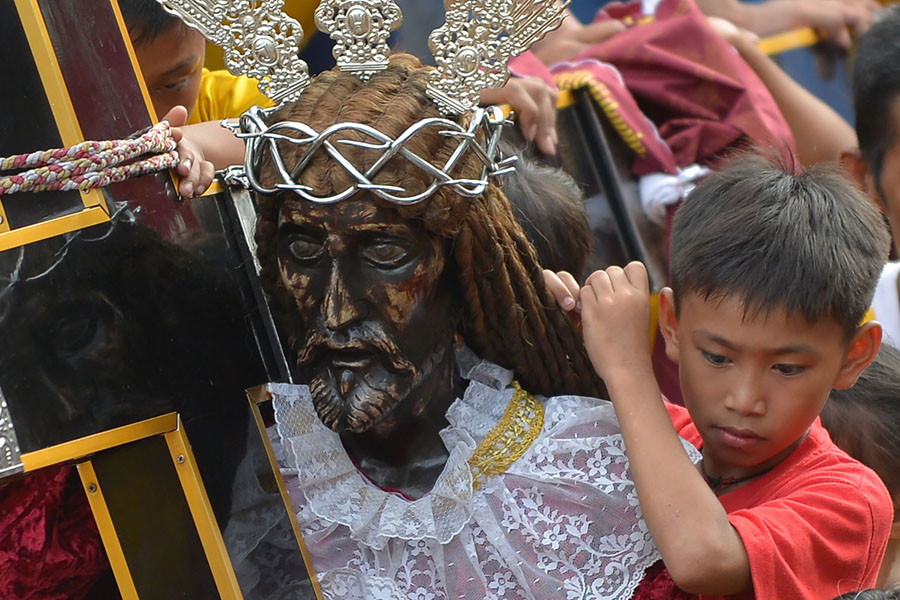 Read moreA young devotee stands next to a replica of the Black Nazarene during a procession outside Quiapo church in Manila on January 7, 2018, ahead of the annual procession on January 9. #