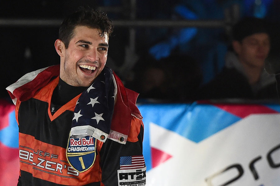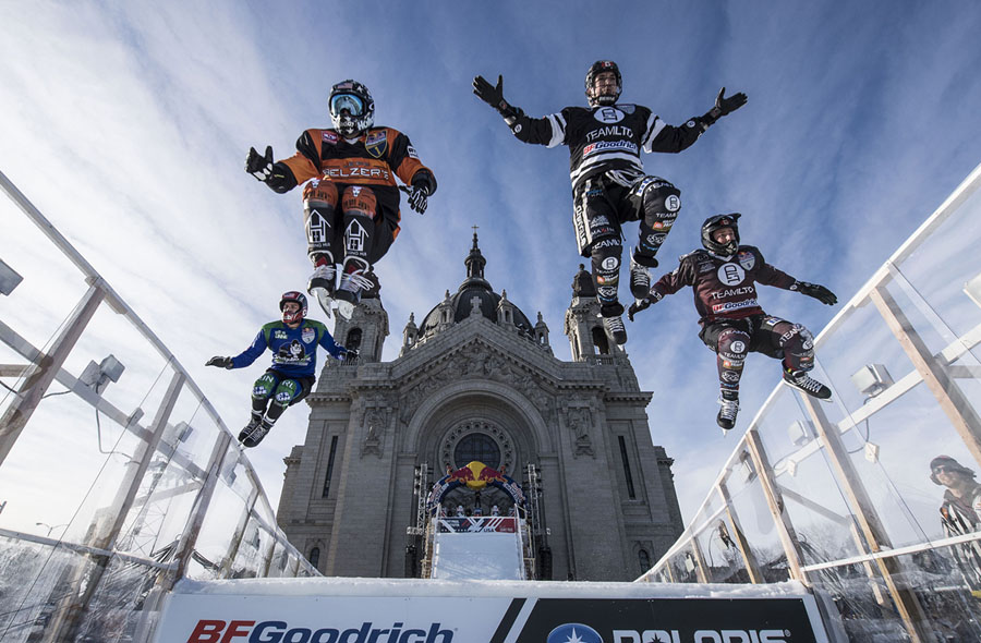 Read moreDean Moriarity of Canada, Dan Witty of the United States, Janne-Petteri Mynttinen of Finland, and Sever Lundquist of the United States race in the final stage of the ATSX Ice Cross Downhill World Championship in Saint Paul, Minnesota, on February 27, 2016. #
