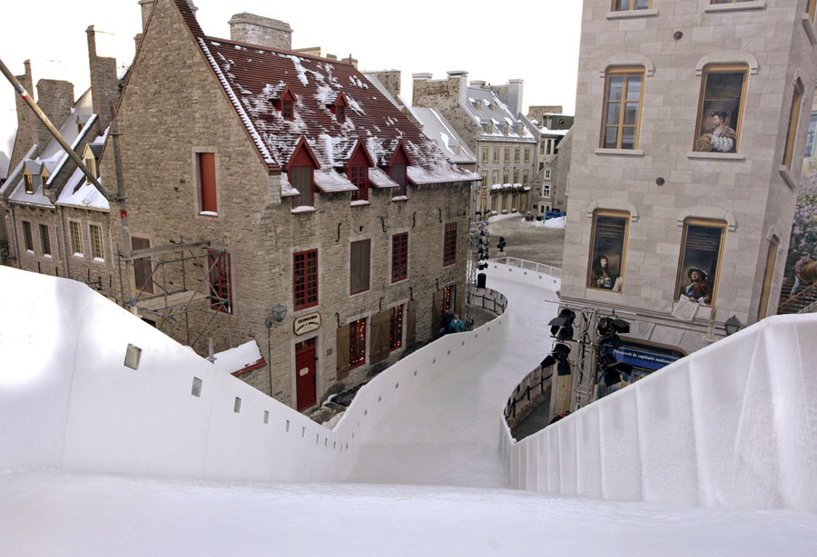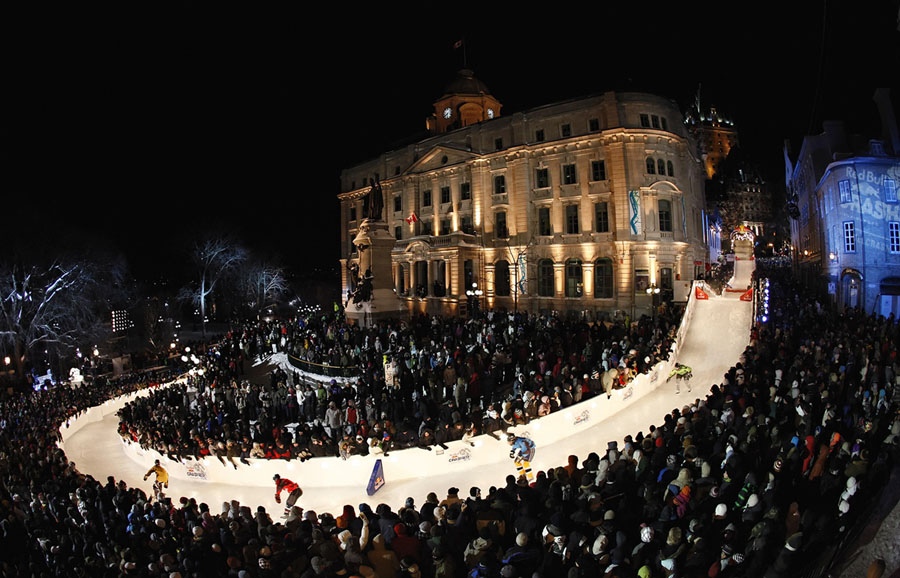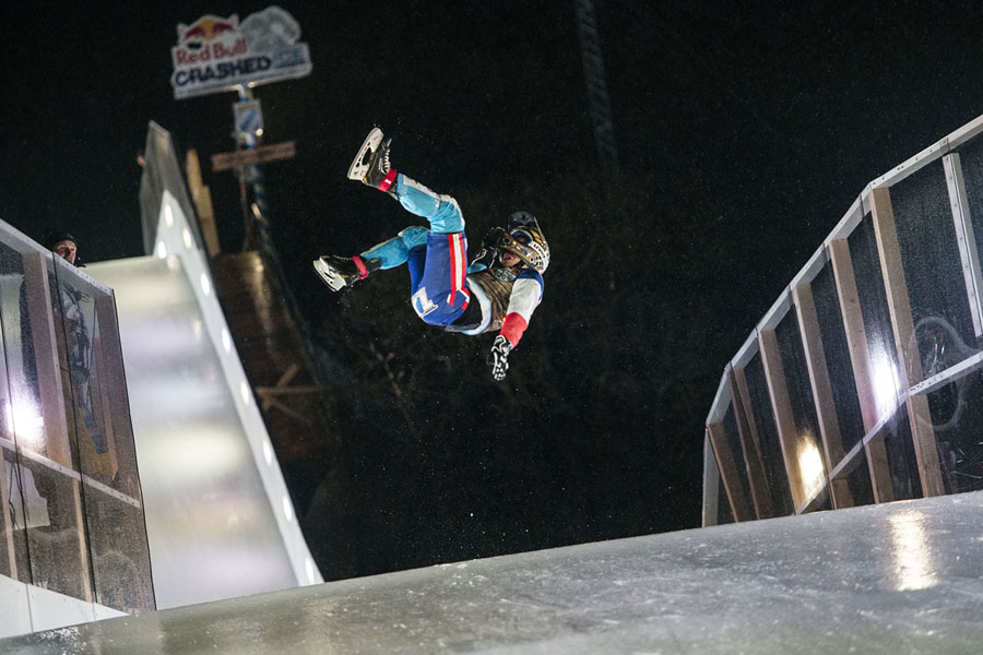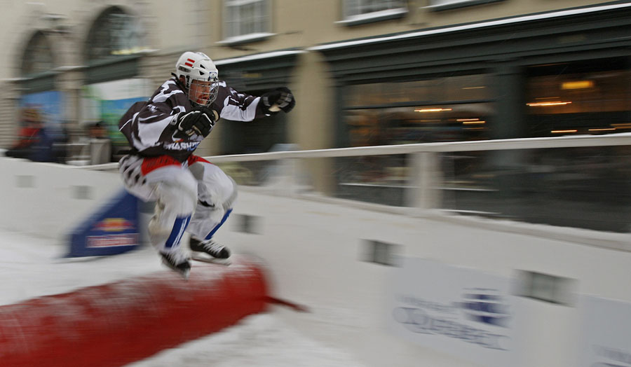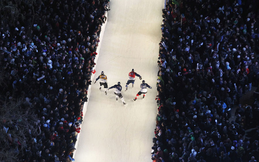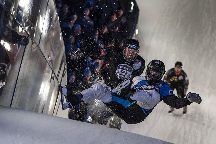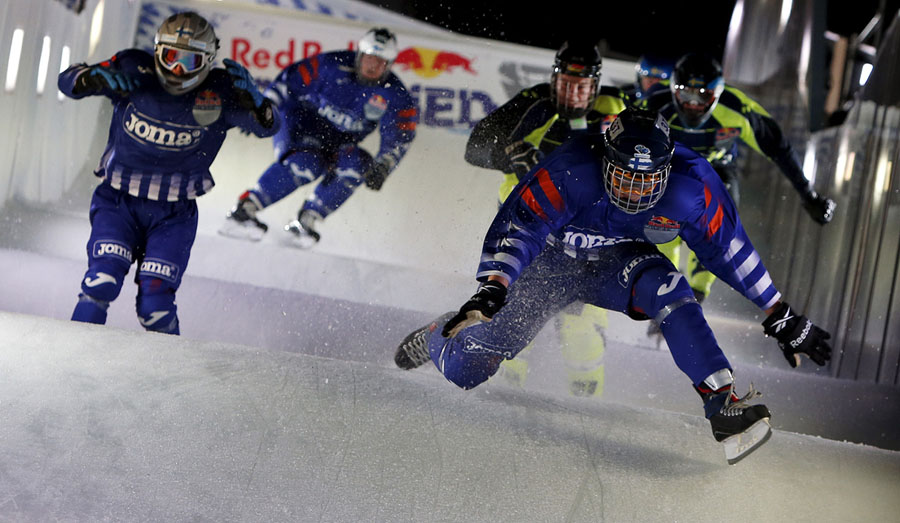 Imagine hurtling down a narrow, twisting, hilly ice track on skates at speeds up to 50 miles per hour, then trying to go even faster so you can outpace the competitors at your elbow. This is downhill ice cross. Beginning back in 2001, Red Bull has been sponsoring races and a world tour under the name “Red Bull Crashed Ice,” building enormous ice tracks in historic city centers to challenge the racers who train for the sport. The tracks are made of steel scaffolding, topped by wood shaped to the desired curves, covered with flexible mats and a network of tubes filled with cooled fluid like glycol—then water is sprayed onto the whole track, slowly building up a four-inch layer of slick ice. Gathered here are ice cross images from recent years in cities in Europe and North America.