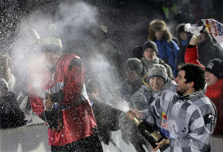 Read moreWinner Arttu Pihlainen of Finland, left, and third-place winner Kilian Braun of Switzerland, right, celebrate after the final of the Red Bull Crashed Ice competition in the former imperial estate of Kolomenskoye in Moscow, Russia, on February 26, 2011. #