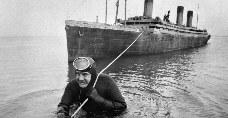 Read moreOriginal caption: Professional frogman Courtney Brown tows a 55-foot scale model of the sunken liner Titanic during work on the film Raise the Titanic! (released in 1980.) The screen version of the best-selling novel by Clive Cussler dramatizes an attempt to raise the 46,000-ton wreck of the Titanic, which is 2 1/2 miles down on the floor of the North Atlantic. The model is described as "an exact replica costing $5,000,000." (This replica ship still exists, rusting in bushes beside a water tank at the Malta Film Studios, visible on Google Maps.) #