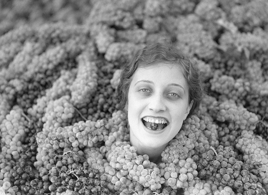 Read moreOriginal caption: Burbank, California: Celebrating the harvesting of California's 1930 grape crop, one of the largest on record, society girls of Burbank staged their open-air festival in the famous McClure Vineyards, during which they crowned the 1930 "Queen of the Vineyards" to rule over the $50,000,000 yield. Photo shows Wilma Smith, buried in grapes, eating a sample. #