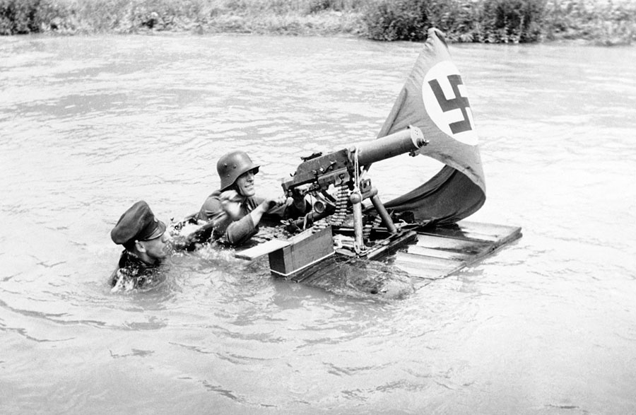 Read moreOriginal caption: July 17, 1938—Vienna Police lifeboats competed on the Danube Canal in races. During the gathering, two soldiers demonstrated the art of swimming a machine gun along the Danube, spattering bullets as they went. The gun was mounted on a raft, and the two soldiers, using their legs like paddles, drove the craft upstream, demonstrating how simple it is for modern military methods to overcome natural forces such as floods. #