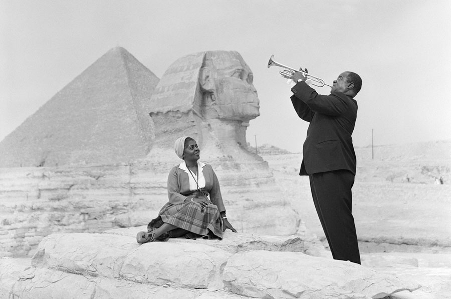 Read moreOriginal caption: January 28, 1961, Pyramids of Giza, Egypt—American jazz trumpeter Louis Armstrong plays the trumpet while his wife sits listening, with the Sphinx and one of the pyramids behind her, during a visit to the pyramids at Giza. #