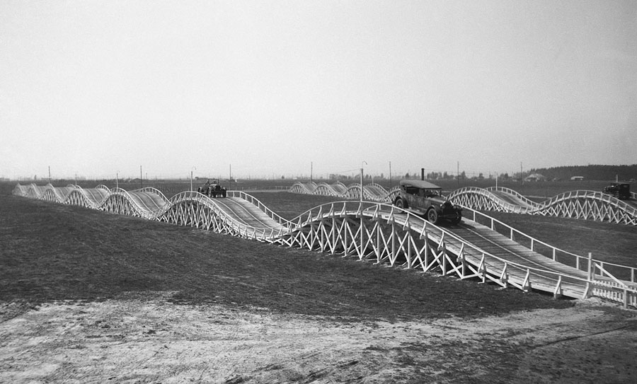 Read moreOriginal caption: Los Angeles, California, ca 1929—This Looks More like the Loop the Loop. Here's a humpy highway for meandering motorists. It was designed and built by Harry Rocks in Los Angeles, who calls it an "auto thriller" and its unique construction affords a novel trip of 2,400 feet for the autoist who drives his car over its undulating surface. It is shaped like a "U" and supports a speed of 40 miles an hour, although some of the "humps" are ten feet high. This general view of the highways shows the size and construction of his "auto thriller." #