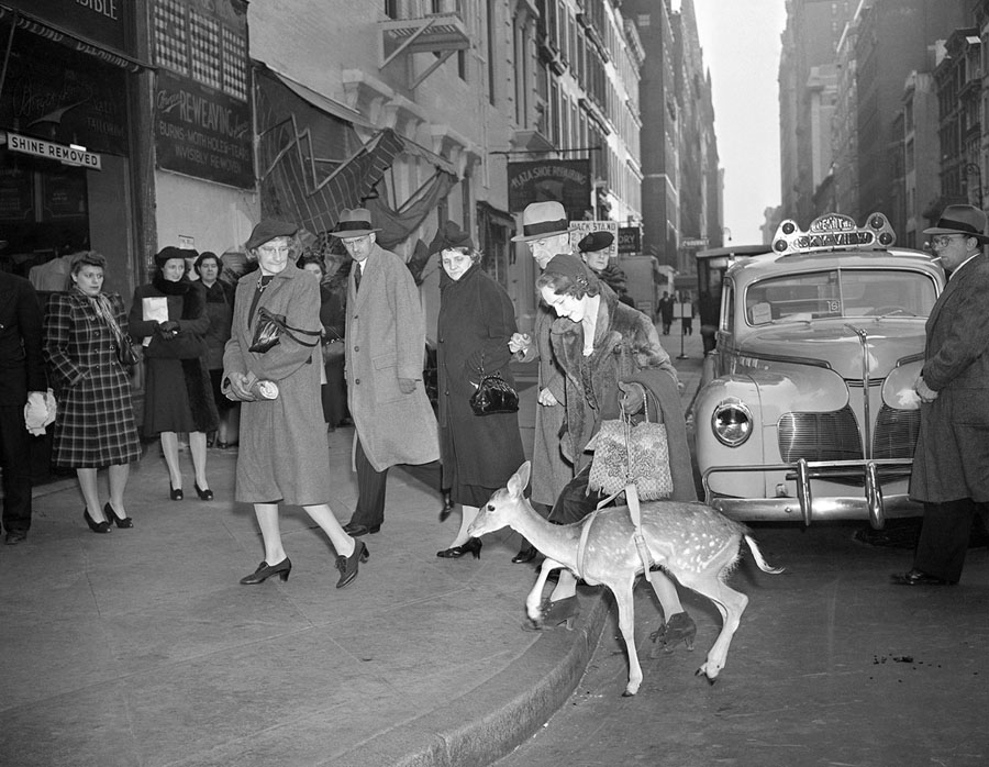 Read moreOriginal caption: Surprised spectators look on in amazement as Miss Beth Pitt takes her pet fawn, Star Message, for a walk in midtown New York on November 16, 1942. Earlier in the day Miss Pitt paid a fine of $2 in court for letting her pet to roam free in Central Park. #