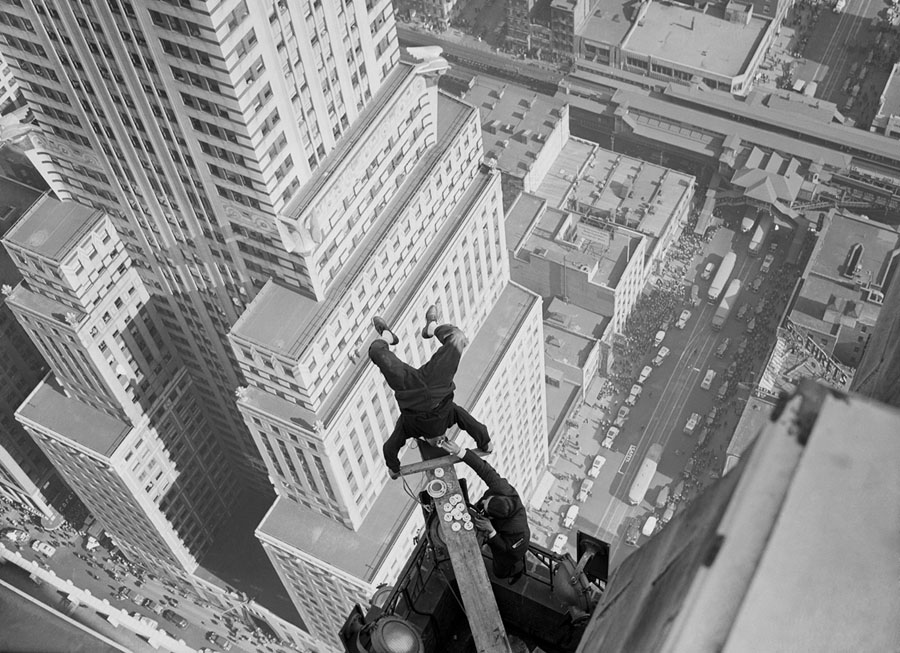 Read moreOriginal caption: Alvin "Shipwreck" Kelly celebrates Friday the 13th in October of 1939 by standing on his head on a board stuck out from the 54th floor of the Chanin Building, and dunking doughnuts over Manhattan. #
