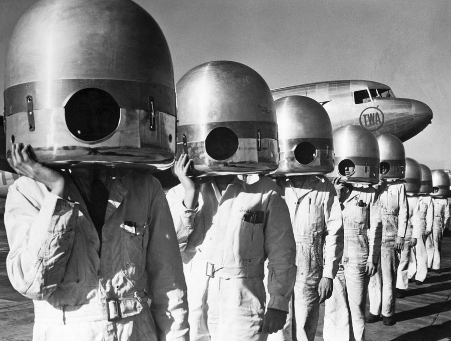 Read moreOriginal caption: May 8, 1941, New York, La Guardia Field. No, these are not men from Mars, but TWA mechanics and inspectors with propeller hub caps over their heads as they go about spring overhauling chores on the giant transport planes at the airport. #