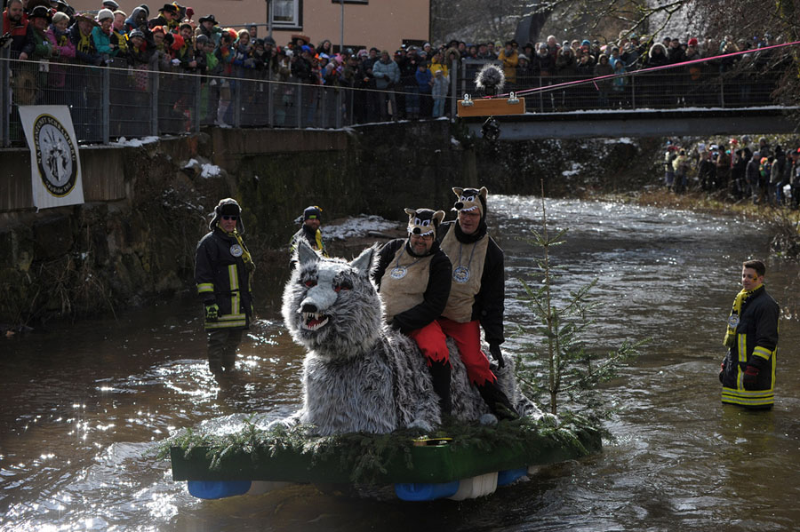 Read moreCarnival revelers ride down the Schiltach stream atop their float during the "bach na fahre" (race down the stream) raft contest on Rose Monday in the southwestern Black Forest town of Schramberg, Germany, on February 12, 2018. #