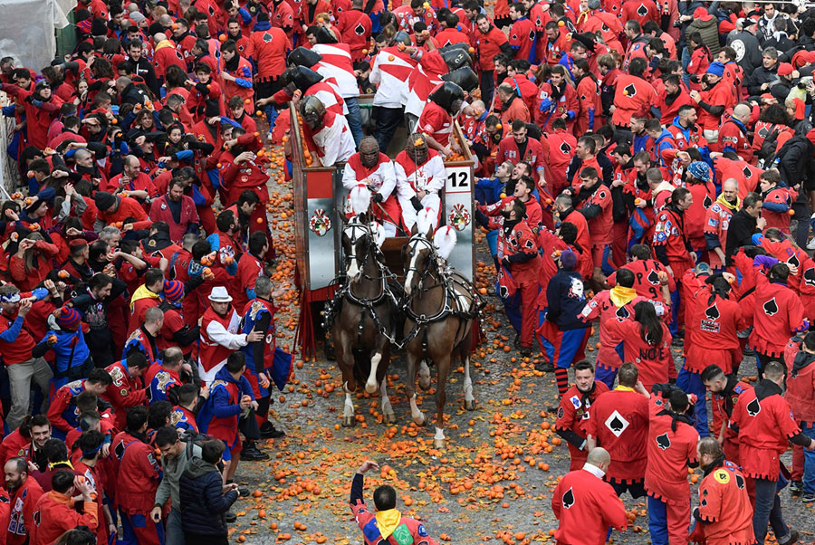 Read moreIn Ivrea, Italy, people throw oranges at each other during the traditional "Oranges Battle" of Ivrea Carnival, near Turin, on February 11, 2018. Established in 1808, the Carnival of Ivrea is one of the oldest and most particular festivals in the world. It is the Battle of the Oranges that evokes the civil war that broke out between the people of Ivrea and the Royal Napoleonic Troops. The battle is made up of squads of aranceri (or orange throwers on foot, representing the people) and those defending their piazzas from the oranges (which represent arrows) on carts (representing the Napoleonic troops). #