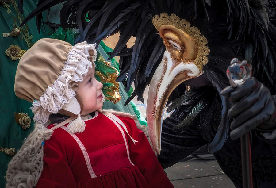 Read moreA child wearing a carnival costume looks up at a man wearing a costume in St. Mark's Square on February 10, 2018, in Venice, Italy. The theme for the 2018 edition of Venice Carnival is 'Playing,' and it runs from January 27 to February 13. #