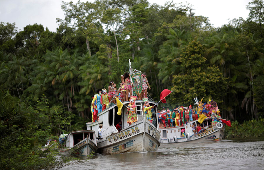 Read moreMembers of the "Bloco Ultima Hora" group ride atop boats during the Carnival of the Waters, where costumed and colorful boats navigate the river Tentem around the islands near the city of Cameta, Brazil, on February 10, 2018. #