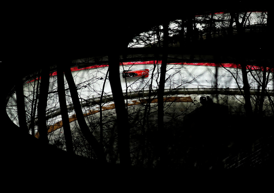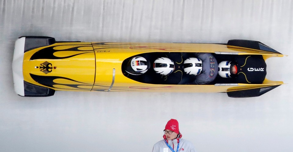 Read moreNico Walther, Kevin Kuske, Christian Poser, and Eric Franke of Germany train for the men's four-man bobsleigh event at the Olympic Sliding Center on February 21, 2018. #
