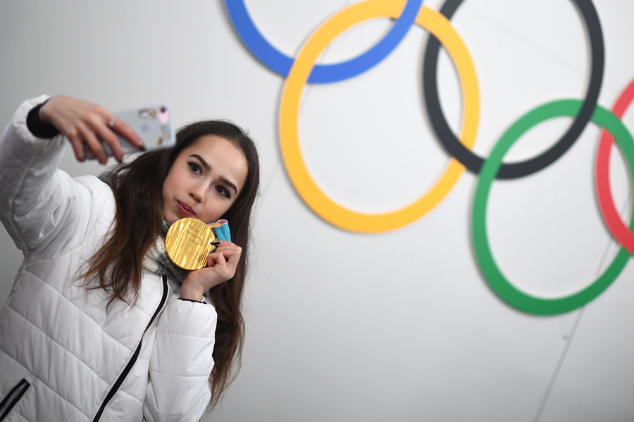 Read moreRussia's figure-skating gold medallist Alina Zagitova poses for a selfie in front of Olympic rings backstage at the Athletes' Lounge during the medal ceremonies at the Pyeongchang Medals Plaza on February 23, 2018. #
