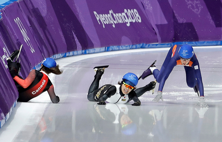 Read moreIvanie Blondin of Canada, Ayano Sato of Japan, and Annouk van der Weijden of the Netherlands, from left to right, crash during the women's mass start speed-skating race at the Gangneung Oval on February 24, 2018. #
