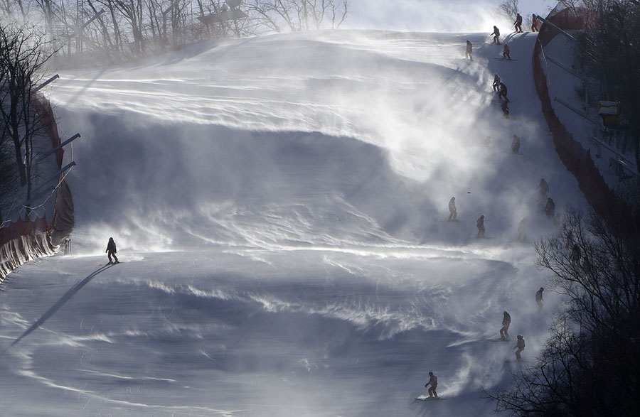 Read moreCourse crew members make their way to the finish area after the women's giant slalom was postponed due to high winds at the Yongpyong Alpine Center on February 12, 2018. #