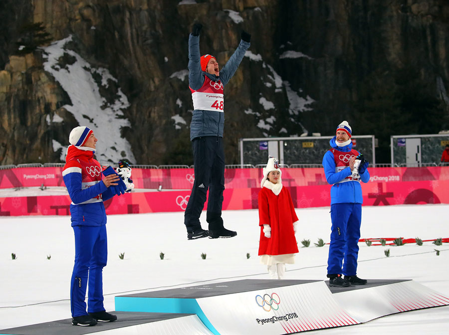 Read moreJohann Andre Forfang of Norway, Andreas Wellinger of Germany, and Robert Johansson of Norway celebrate on the podium after Wellinger (in midair) won the gold at the men’s normal hill individual ski-jumping final at the Alpensia Ski Jumping Center on February 10, 2018. #