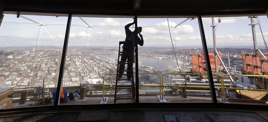 Read moreA glazer works on glass panels on the exterior wall of the Space Needle observation deck, where larger glass panels behind him begin to line the exterior viewing platform and views north on March 20, 2018, in Seattle, Washington. The privately funded $100 million renovation of the 55-year old structure is designed to increase the views approximately 500 feet above the ground. It will include the replacement of wire barriers on the observation deck with outward-slanted glass, and short exterior walls will be replaced with the floor-to-ceiling glass panels. #
