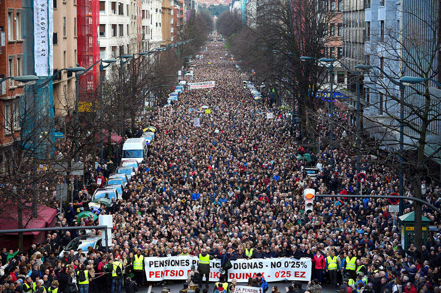 Read moreThousands of pensioners march behind a banner reading "Dignified Public Pensions. No to 0.25%" during a protest in favor of higher state pensions, in Bilbao, Spain, on March 17, 2018. #