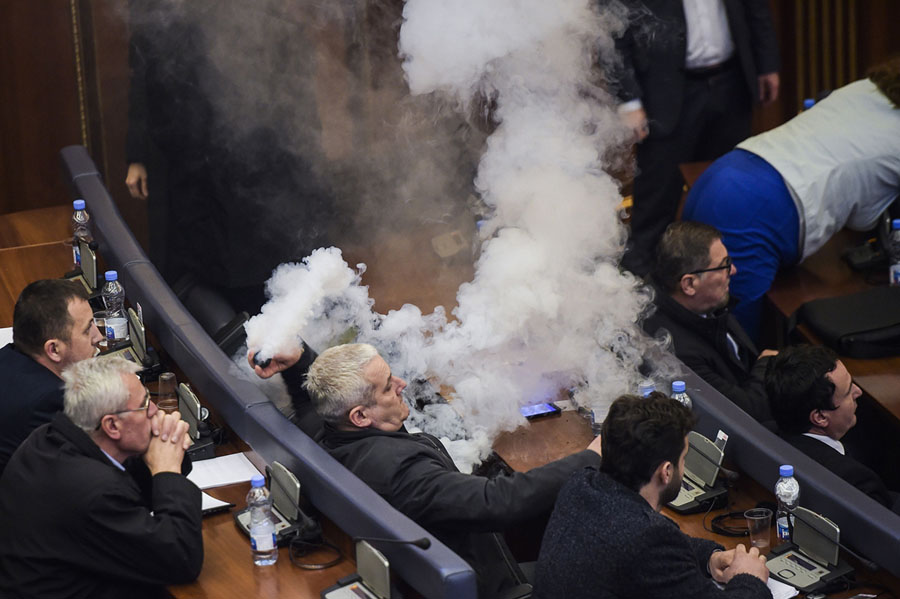 Read moreA Kosovo opposition lawmaker throws a tear-gas canister during a parliament session in Pristina on March 21, 2018, before a vote on whether to ratify a border deal signed in 2015 with Montenegro. Tear gas was lobbed, halting a vote on a border deal with Montenegro, seen as key for Pristina's bid to join the EU. #