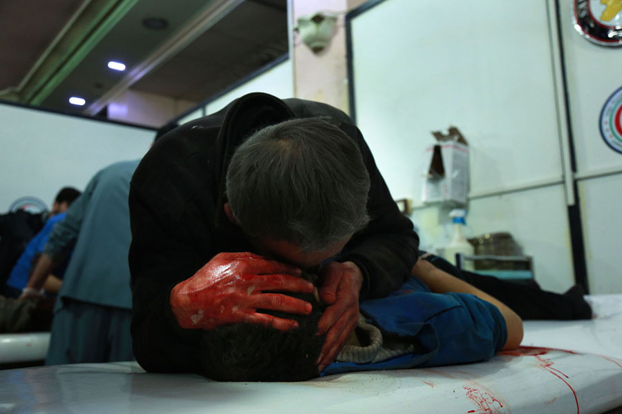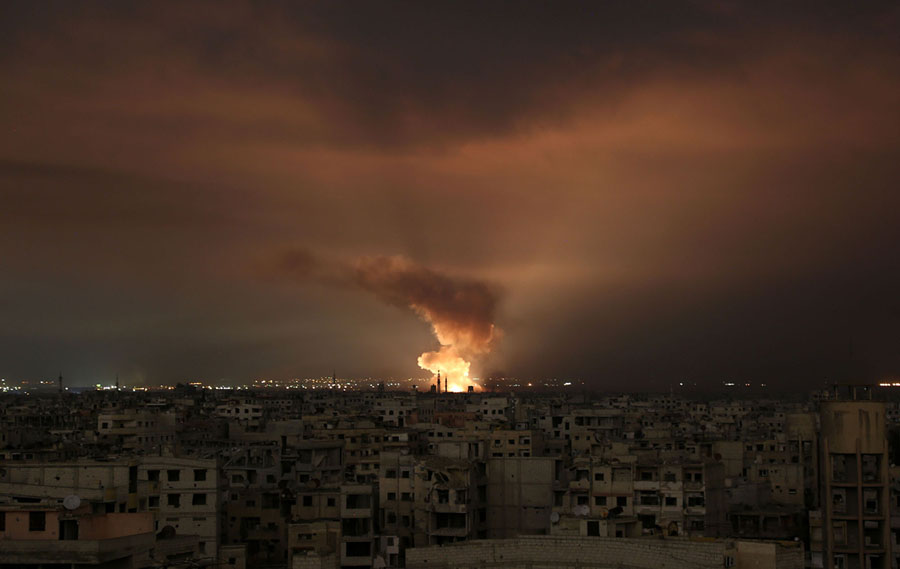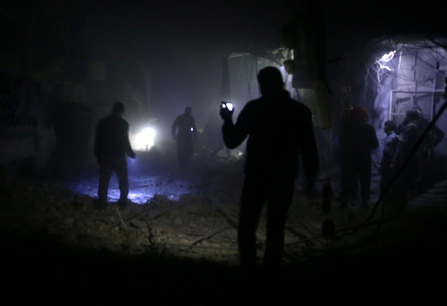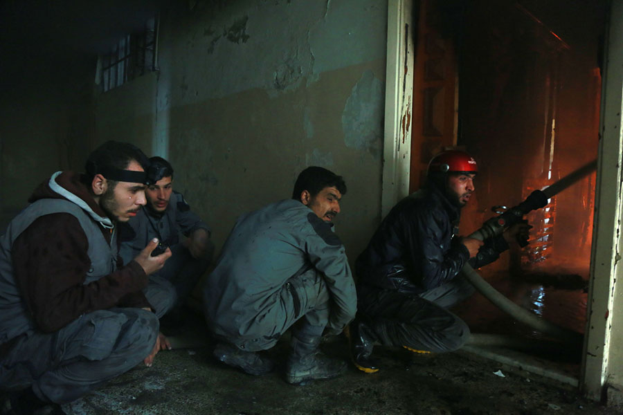 Read moreCivil defense members with a firehose react at a damaged site after an airstrike in the besieged town of Douma, eastern Ghouta, near Damascus, Syria, on February 9, 2018. #