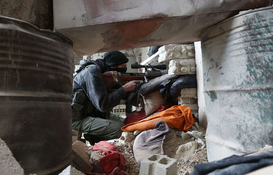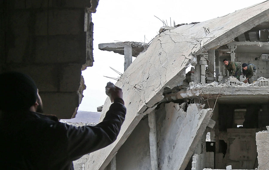Read moreA Syrian opposition fighter from the Failaq al-Rahman brigade walks past damaged buildings on the front line in the rebel-held enclave of Arbin, in eastern Ghouta, on February 15, 2018. #