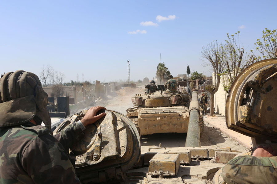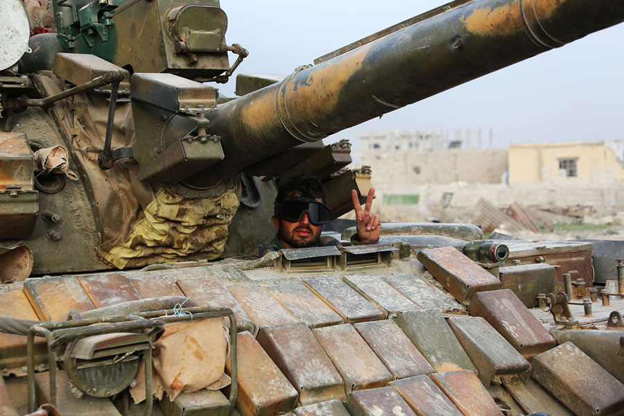 Read moreA member of the Syrian government forces flashes the sign for victory while sitting in a tank after entering al-Shifoniya as they advance into rebel-held eastern Ghouta on March 4, 2018. #