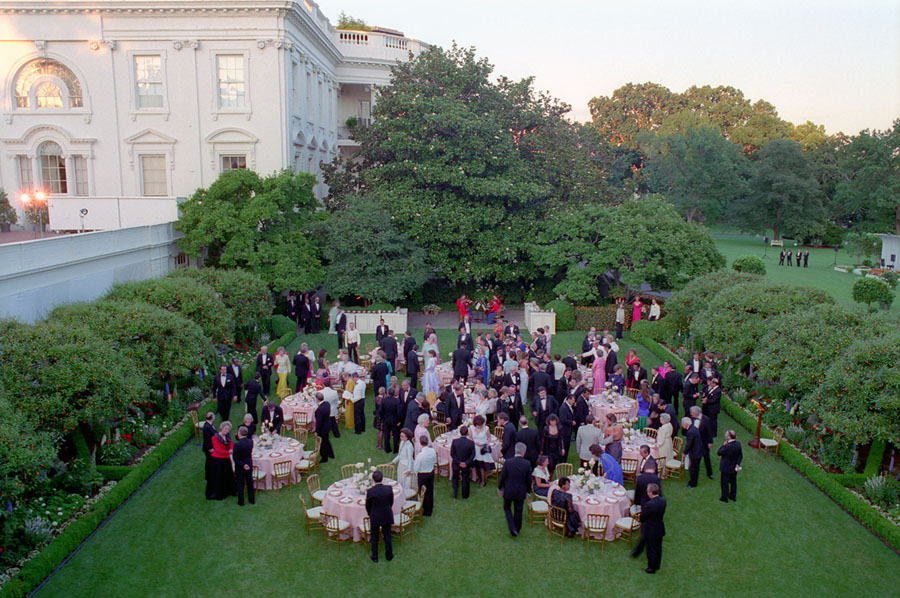 Read moreA view of the White House Rose Garden during the state dinner for President Evren of Turkey on June 27, 1988. President Ronald Reagan can be seen at middle-right, standing in front of a woman who is wearing a pink dress. #
