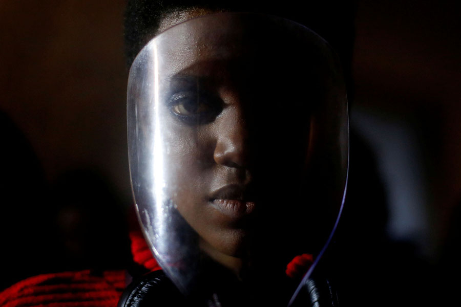 Read moreA model holds a protective mask over her face while preparing backstage before designer Fatima Lopes's Fall/Winter 2018/19 collection show in Lisbon, Portugal, on April 7, 2018. #
