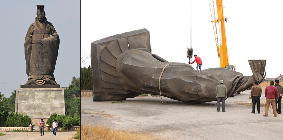 Read moreLeft: A photo taken on September 7, 2015, of a statue of China's first emperor, "Qin Shi Huang." Right: A photo taken on April 7, 2018, after gale force winds had toppled the statue, flattening its face, in Binzhou, Shandong province, China. #