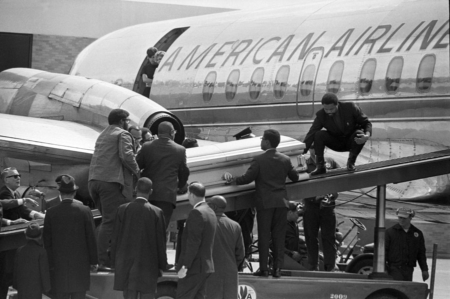 Read moreOriginal caption: "April 5, 1968, Memphis, Tennessee. Casket containing the body of slain civil-rights leader Dr. Martin Luther King Jr. is loaded aboard a plane for transport to his home in Atlanta. Mrs. King flew to Memphis aboard the plane but did not disembark while casket was being loaded." #