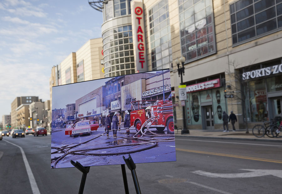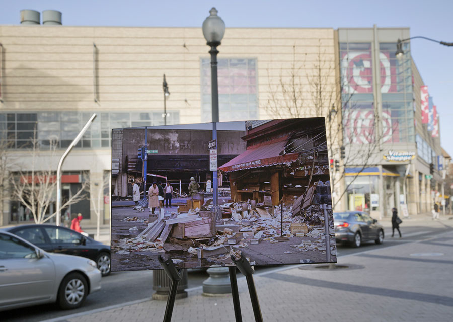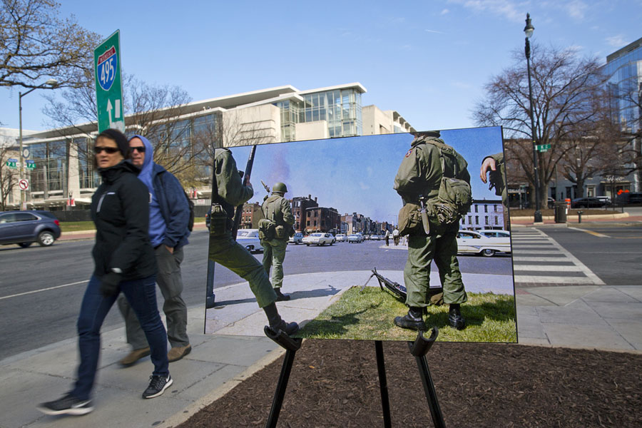 Read moreFor comparison, a print of the previous photo of looted and burned buildings in 1968 is placed on an easel at the present-day shopping area near 14th and Kenyon Streets in northwest Washington, D.C., on March 25, 2018. #