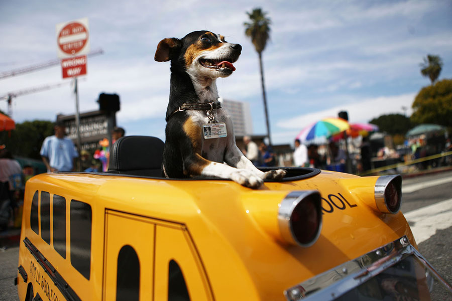 Read moreHomer rides in a mini school bus during the annual Blessing of the Animals ceremony, presided over by Archbishop Jose H. Gomez in Los Angeles, California, on March 31, 2018. Angelenos brought dogs, cats, birds, goats, snakes, and other animals to the event, which is normally held the day before Easter. The tradition dates back to 1930 in Los Angeles. #