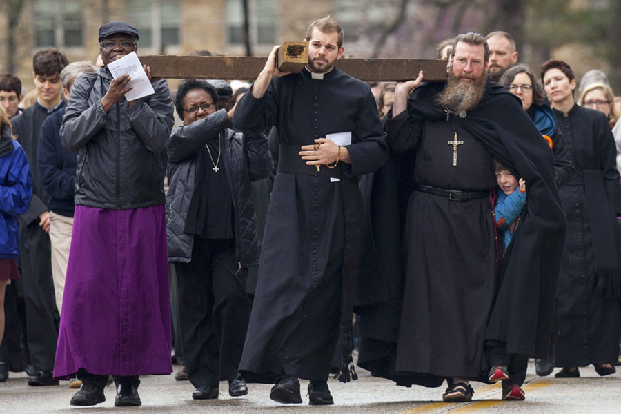 Read moreSix-year-old Jamie Pappas takes shelter from the cold in the cape of his father, the Rev. Jim Pappas, during the Way of the Cross procession on Good Friday at the University of the South in Sewanee, Tennessee, on March 30, 2018. #