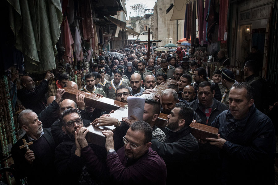 Read moreWorshipers carry a wooden cross down to the entrance of the Church of the Holy Sepulchre during the Way of the Cross procession in the Old City on March 30, 2018, in Jerusalem. #