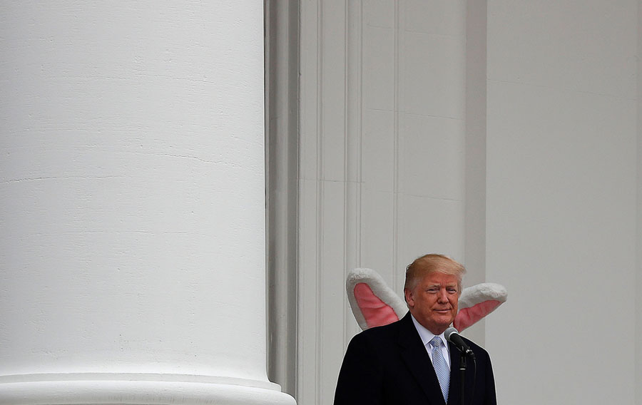 Read morePresident Donald Trump appears on the South Portico of the White House with the Easter Bunny standing behind him as the annual White House Easter Egg Roll is held on the South Lawn of the White House in Washington, D.C., on April 2, 2018. #