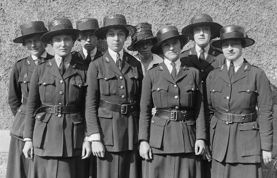 Read moreOriginal caption: "Chauffeurs of the American Fund for French Wounded. They had assisted the Red Cross by driving cars for the Children's Bureau, but are now attached to the Service de Sante, under the French Government. From left to right they are: Miss Rogers, Miss Hughes, Miss Robeson, Miss Caspari, Mrs. Crean, Miss Kennerley, Miss Wilde, and Miss Washburn. September, 1918." #