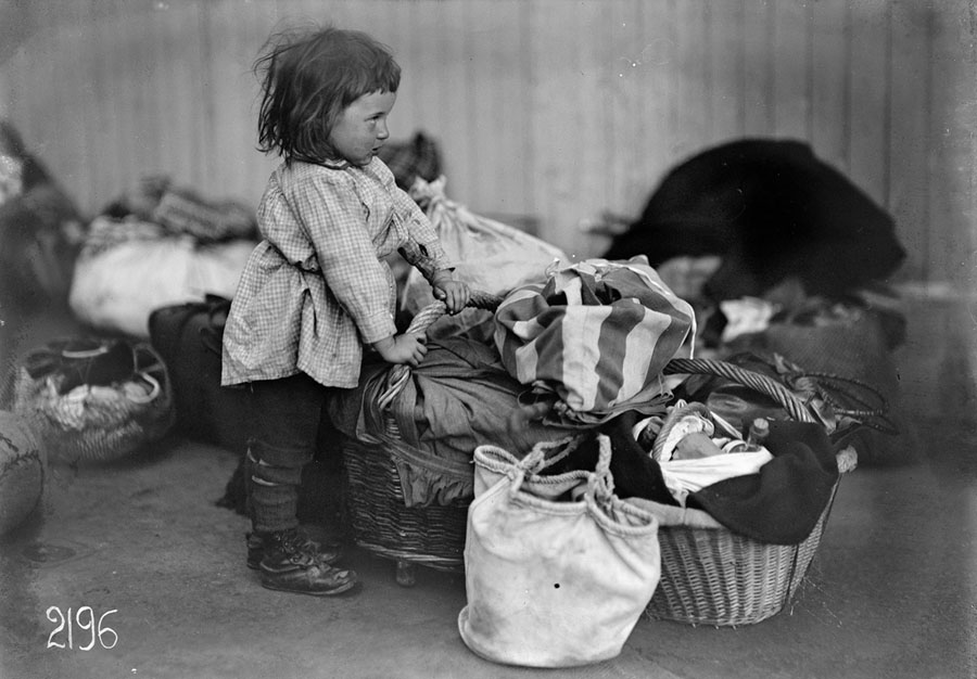 Read moreOriginal caption: "At the Gare de Lyons, Paris. This little refugee stands manfully on the job of taking care of the family baggage until his parents come back. All refugees arriving at this station from the invaded districts are fed and cared for by the Bon Accueuil, a French relief organization, aided by the American Red Cross. June, 1918." #