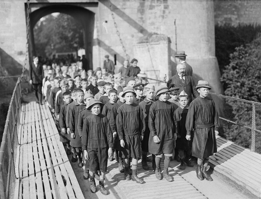 Read moreOriginal caption: "Refugees from Lorraine sing Marseilles as they cross the drawbridge of the old Chateau of Caen. In the enclosure of the Chateau, barracks have been provided for 160 children to live in under the direction of the Prefet Mirman. Among them are 15 'Stars and Stripes' children, French wards of American soldiers. August, 1918." #