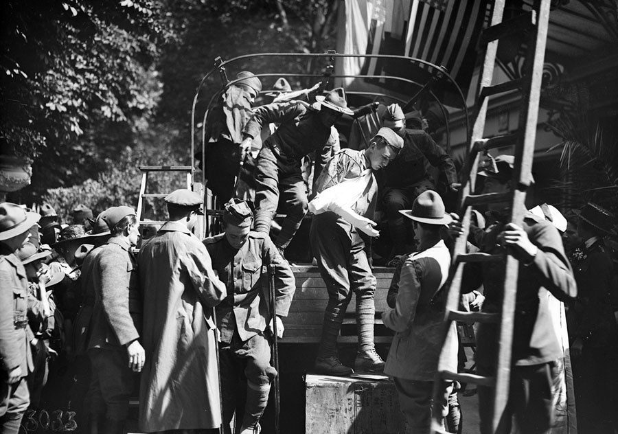Read moreOriginal caption: "Unloading wounded Americans from the trucks which brought them from the hospitals to the famous Parisian cafe 'Les Ambassadeurs,' where the American Red Cross gave them an entertainment on the 4th of July afternoon in 1918." #
